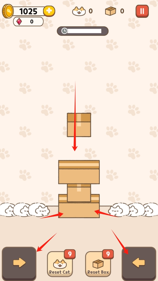 2、游戏中,画面中间会掉下一层层的箱子,有大有小,根据箱子大小,点击左右两边的箭头,小猫就会跳入箱子中来消除。