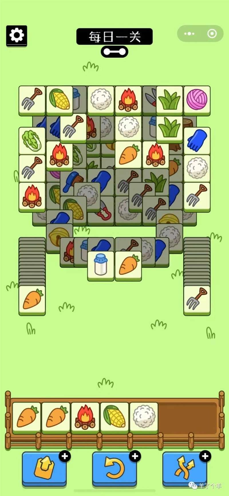 羊了个羊的玩法规则很简单:游戏界面下方设有7个槽位,玩家只需点击3个相同图案的方块放入槽位,它们就会自动消除。另外,下一层的方块需要先将覆盖在其上方的方块移至槽位后,才能被点击使用。