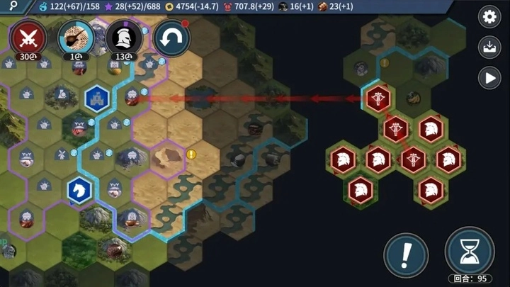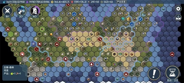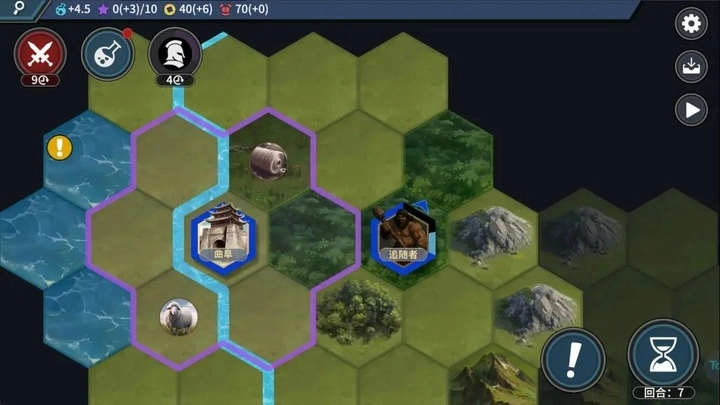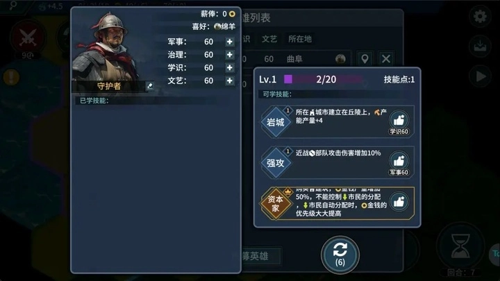 获得英雄后出城作战,通常一到两个回合就能完成升级;而且若在下回合开始前因受击死亡,会自动回城且不计行动消耗。当兵装充足时,用1个兵力换取非军事类英雄的新技能是相当划算的。只要确保粮食足够支撑本阶段每回合增加1名市民,主动出门“送死”能快速叠满低级技能的加成效果(按极难难度的野怪刷新速度来算)。