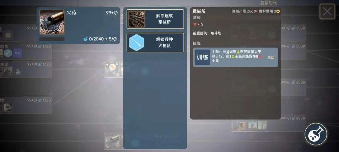 解锁军械所与火枪队,若对自身战力能否抵御入侵没有把握,可优先考虑火药,再推行公司制度。