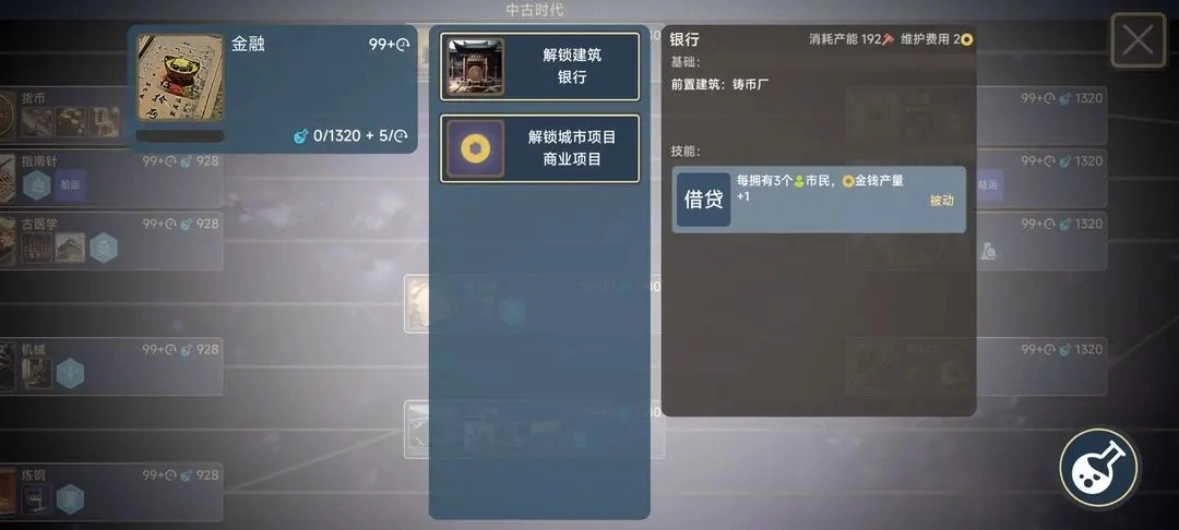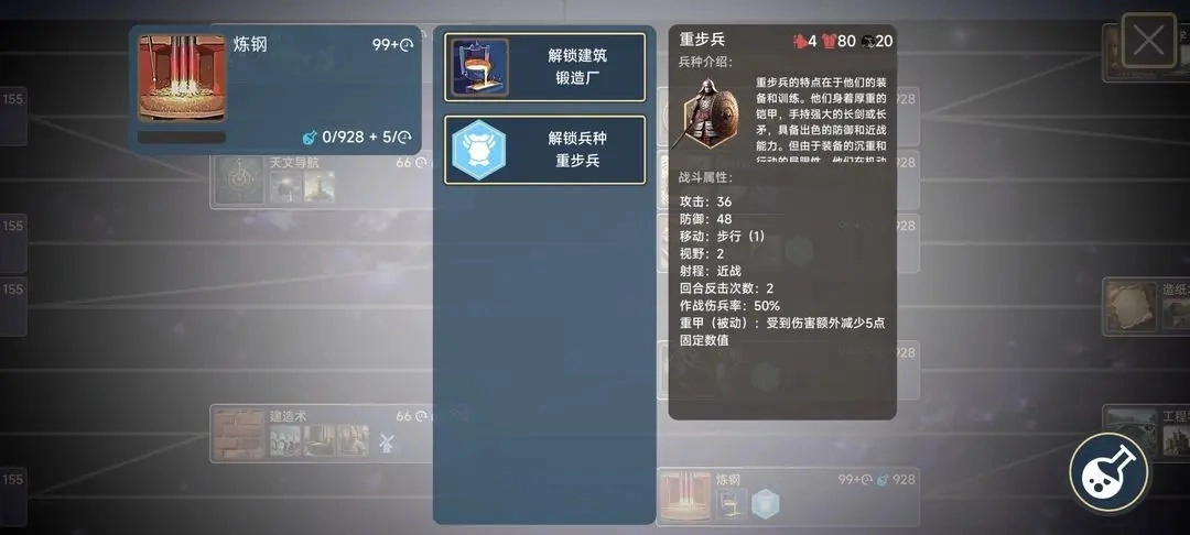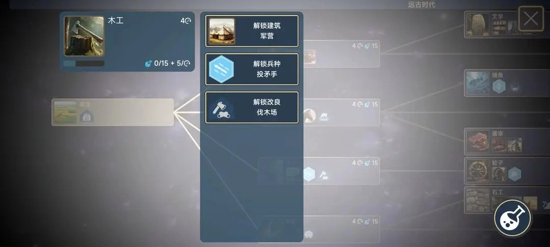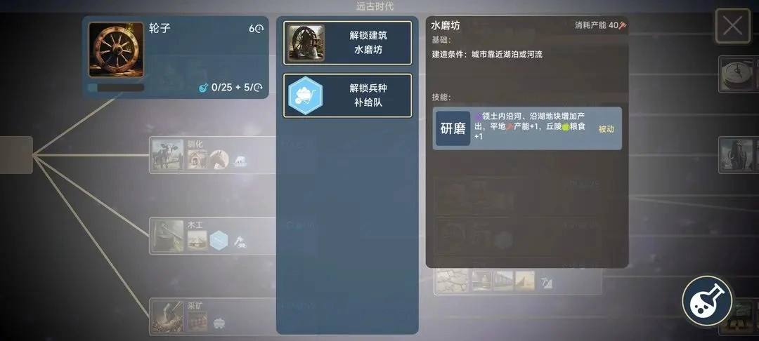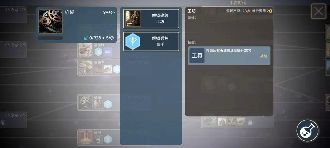 屠宰、弓箭、机械这三项,解锁后就能建造工坊了。如果时间充裕的话,也可以先搞机械再去炼钢。