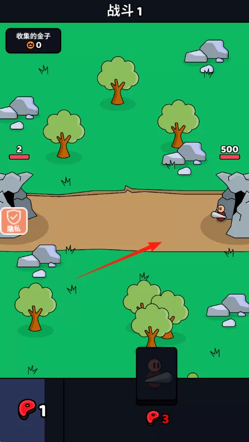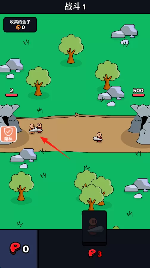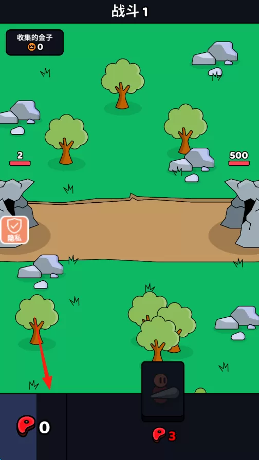 1进入【战斗1】界面时,请注意左下角类似骨头的资源计数初始值为0,同时留意左上角显示的【收集的金子】数量。
