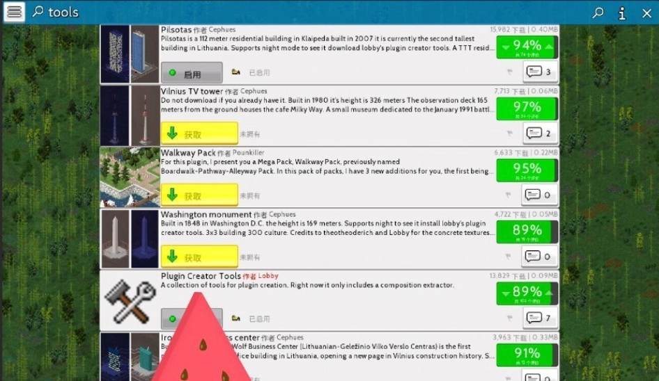 2、在搜索框里搜索 “tools”然后找到“Plugin Creators Tools”,点击,完毕后重新启动游戏(把游戏从后台进程中取消)