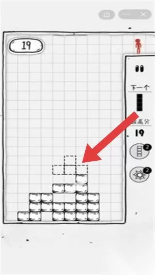 1、界面上显示的信息包括左上角的数字“19”(代表关卡数或得分),右侧有“下一个”字样(表示接下来的方块),同时也会显示出当前得分为“19”,此外还有一些功能按钮(如齿轮等图标)。