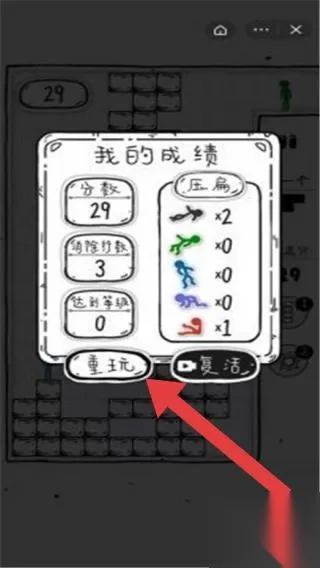 2、采用手绘风格,分数“29”,消除行数“3”,达到等级“0”,“压扁”一列显示不同颜色小人的数量(黑色小人x2、红色小人x1),还有“重玩”和“复活”按钮。