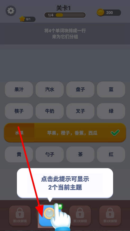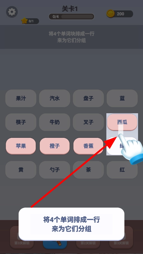 进入关卡后,根据提示把4个单词排成一行以完成分组,认真观察这些单词,选择契合主题的单词进行排列,从而完成分组任务。