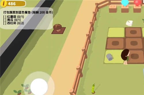 任务是把蔬菜打包到蓝色餐垫里,这时候我们只需操作角色把上述提到的菜都种下去就行。