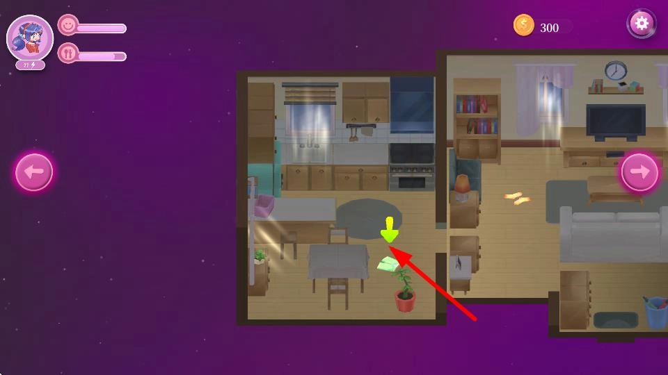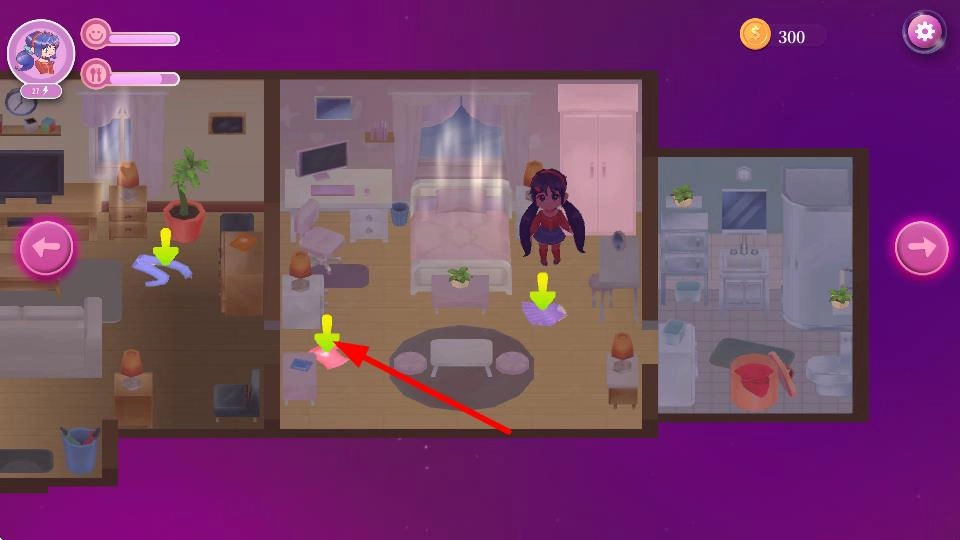 在房间场景里,点击箭头所指的粉色物品区域,物品就会执行整理或清洁动作,从而提高房间的整洁程度。