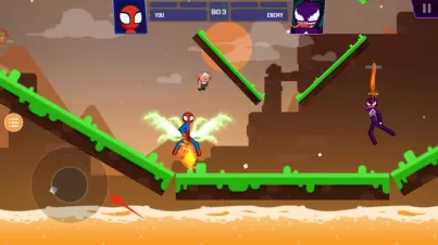 1、用左侧摇杆控制蜘蛛侠火柴人形象,在草地、山坡场景移动,跨越障碍绿色斜坡。