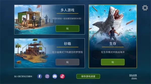 1首先启动海洋游牧者游戏,这里有三种模式供您选择:沙盒模式,您可以在此模式下构建自己的梦想木筏;生存模式,让您在广阔的海洋中迎接挑战;多人游戏模式,您可以与朋友们共同创建独特的木筏。