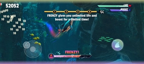 在这款游戏里,操控鲨鱼的方法依旧简单易懂。左边屏幕用来控制移动方向,右边是加速按钮。只要不断吞食小鱼,就能慢慢积累能量,激活加速功能,进而解锁更高分数。