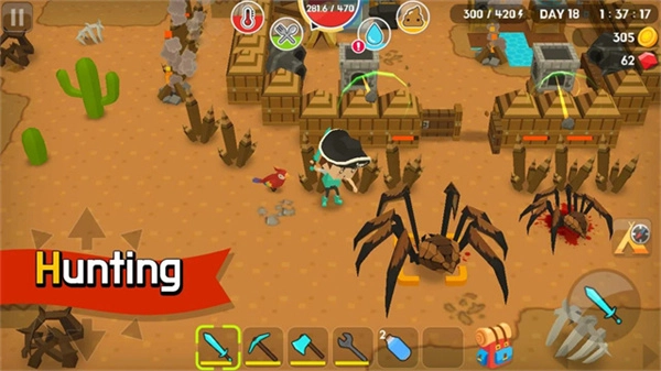 在这个游戏里,打猎绝对算得上最让人头疼的环节之一。鸡、猪、蜘蛛、公鹿这些家伙都会主动攻击人,而兔子、松鼠、母鹿和梅花鹿又跑得飞快,根本追不上。这时候陷阱就成了关键道具。要是遇到蜘蛛,你可以在它附近布下陷阱,等它追过来时你赶紧躲开,它自己就会掉进陷阱里。对付其他动物更简单,直接把陷阱放在它们所在的位置,这些家伙会自己往陷阱里钻,你只需要等着捡肉就行。