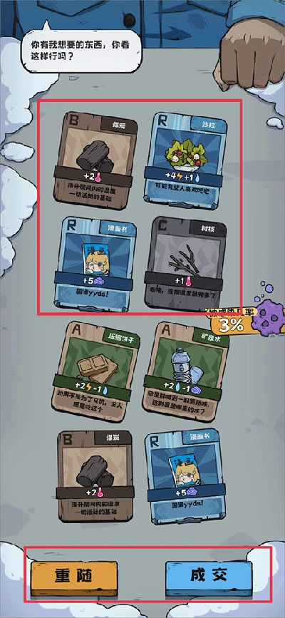 然后对方会依据你的卡牌给出他的卡牌,要是对对方给出的卡牌满意,你可以点击成交;要是不满意,就点击重随。