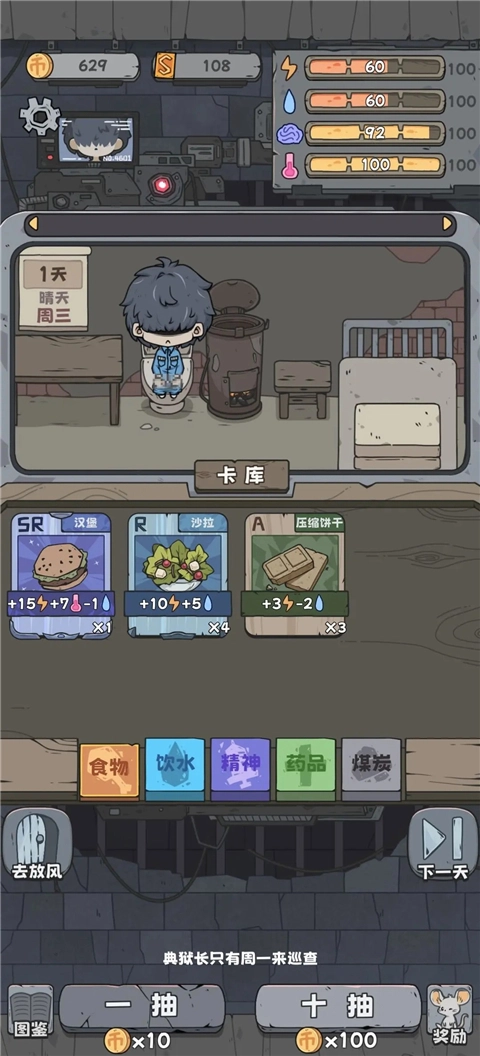 要想获得出狱的机会,就得在100天内抽到100张SSR卡,不过抽卡得用金币,并且金币只有在新一天开始时才能得到。