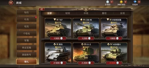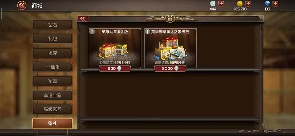 当玩家等级达到16级,即可解锁赠礼商城。在赠礼商城里,玩家能够向自己的好友,或者所在军团的成员,赠送坦克、涂装、道具以及英雄勋章礼包。赠礼商城主要包含友谊币、赠送坦克、赠送涂装、赠送道具、赠送礼包等面板。