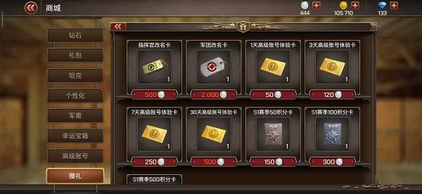 赠送道具操作流程和赠送坦克也一样,赠送道具界面可赠送指挥官改名卡、军团改名卡、高级账号体验卡、赛季积分卡。可以自由选择想赠送的道具哦~