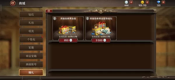 赠送礼包主要针对英雄勋章黄金版和英雄勋章黄金版等级包,操作流程与赠送坦克一样。