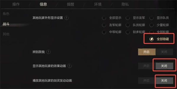 要是开启后还是有卡顿、不流畅的情况,大家可以在【菜单栏】→【信息】→【战斗】里选择开启“全部隐藏其他玩家外形显示”的功能,以此减少同屏显示的玩家数量。