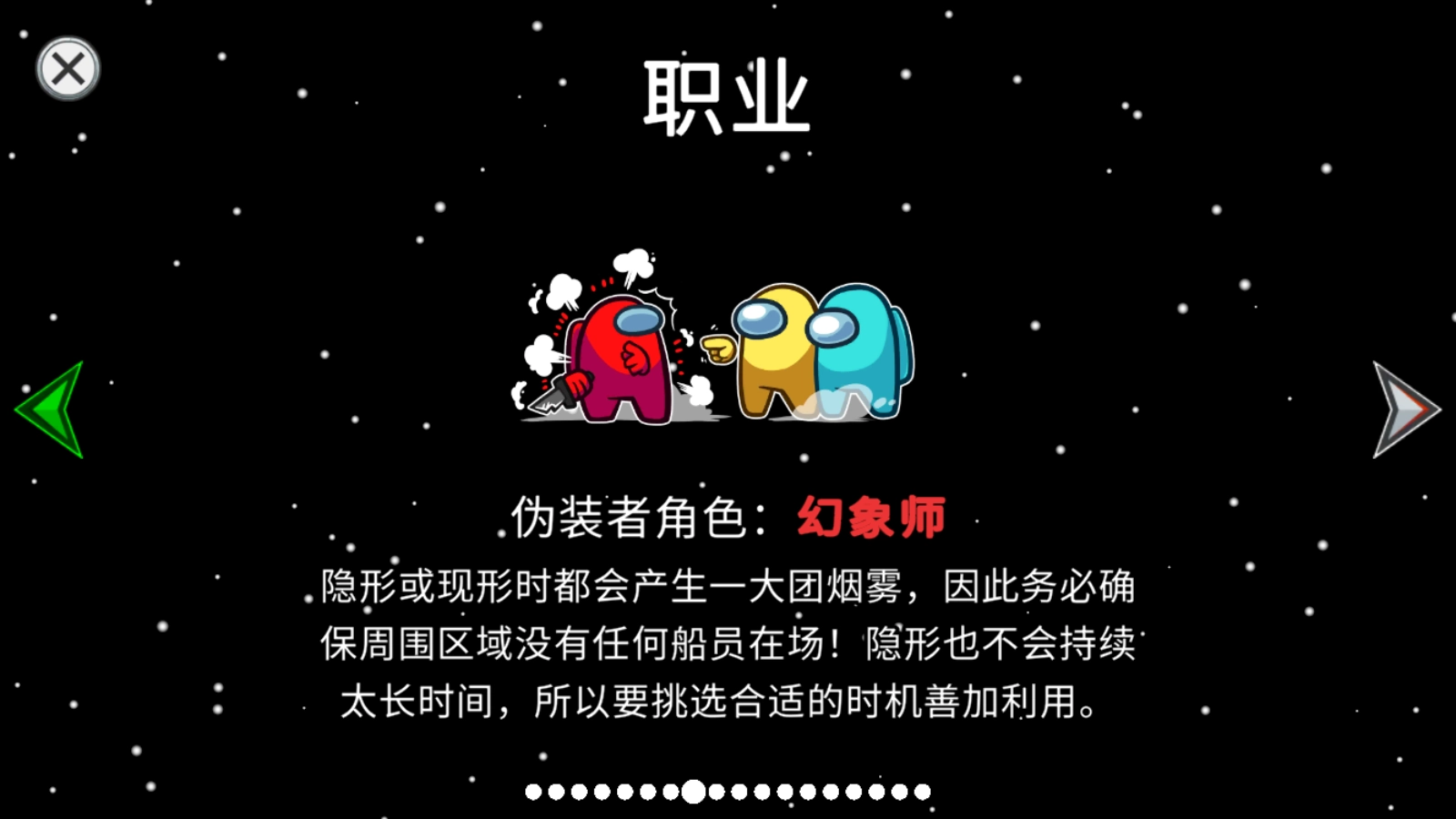 幻象师能够隐匿自己的踪迹,悄悄尾随某位船员,或是在不被察觉的情况下离开作案现场。处于隐形状态时,幻象师无法进行攻击,但仍可借助梯子与滑索行动。无论是进入隐形状态还是解除隐形状态,都会出现一团浓密的烟雾,所以必须保证周边没有任何船员!而且隐形状态的持续时间并不长,需要找准恰当的时机合理运用。