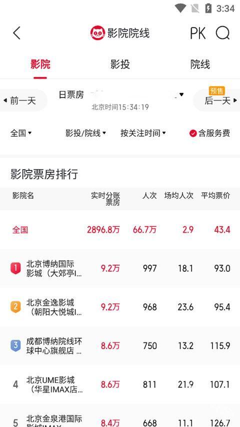 它为用户提供了综合影院票房排名,用户也可以按照票房从高到低、人次从高到低、上座率从高到低等维度进行排序。