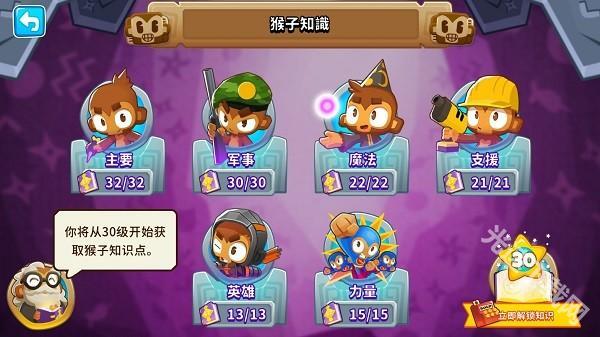 在气球塔防游戏里,“猴字知识”属于天赋系统,玩家借助它能够为自己的塔解锁天赋。该系统总共包含初级猴子、军事猴子、魔法猴子、辅助猴子、英雄以及力量这6类不同的天赋树。