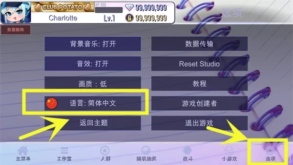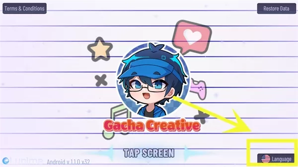 1、在本站下载并安装加查创意(Gacha Creative),进入游戏后会发现游戏默认为英文状态,此时需点击右下角按钮,具体位置如下图所示。