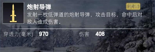炮射导弹是一项武器技能,可发射一枚低弹道的炮射导弹打击敌人,其穿深达970mm,标准伤害为408。由于弹道较低,该技能无法隔着掩体发起攻击,对地形条件的要求也较为严苛。