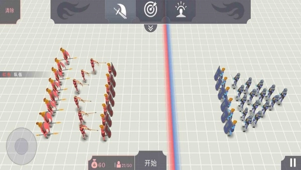 玩家点击中间区域的图案,即可挑选不同类型的士兵部署到战场,待所有部署操作完成后,点击开始按钮即可进入游戏。
