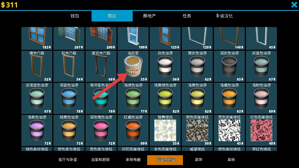 去商店挑选油灰浆这类材料,用金币把它们买下来,好为房屋的修缮工作筹备所需的物资。