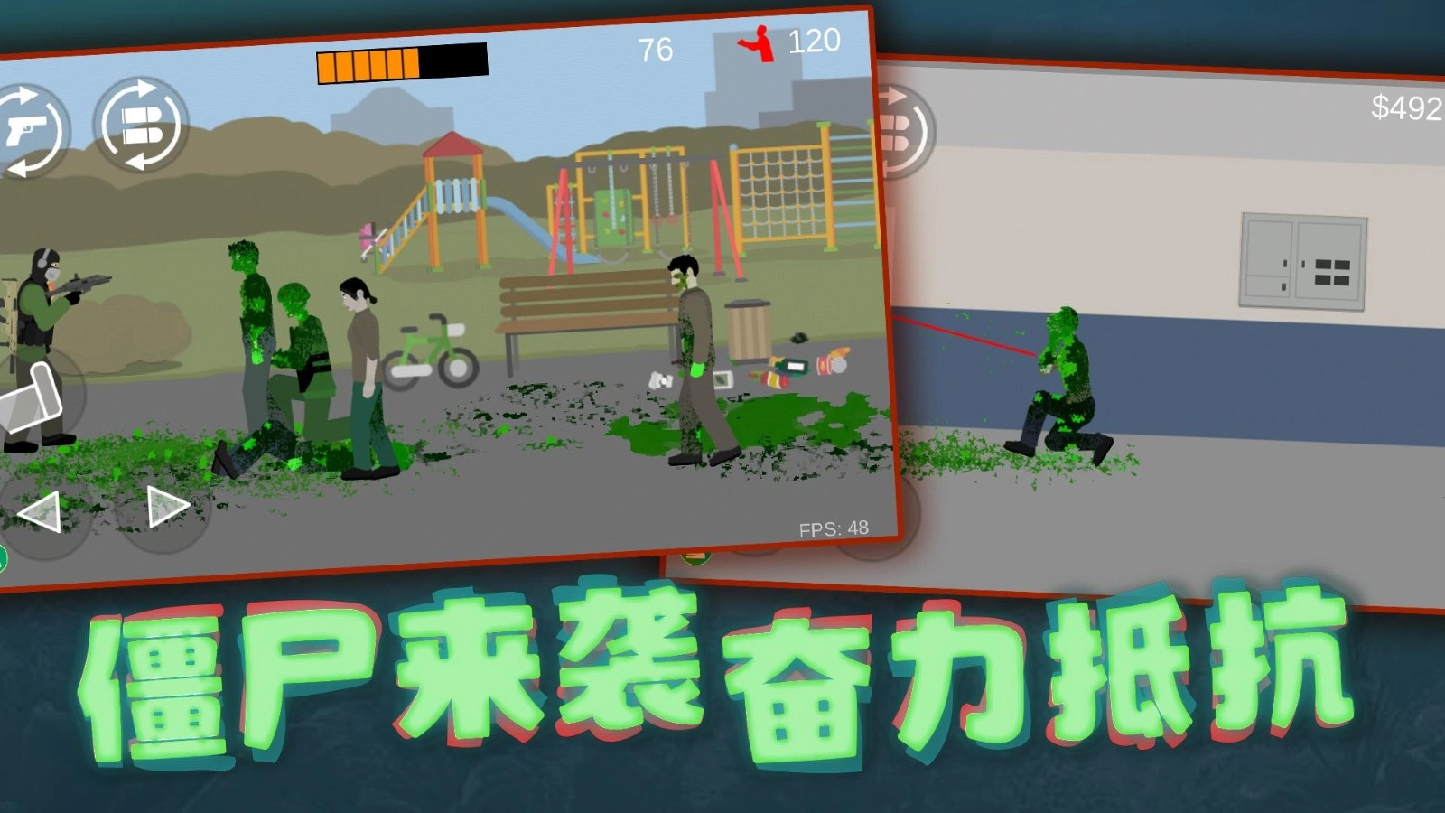 在战斗过程中操控角色向僵尸射击,收集散落在地面的资源,并利用场景中的元素来击败僵尸,从而确保生存。