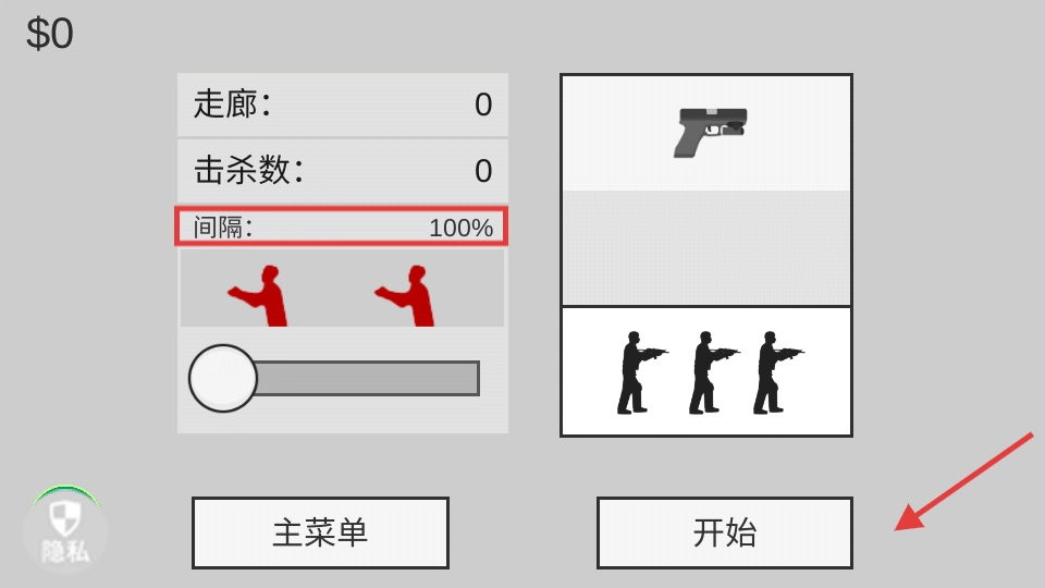 确认【间隔】数值已设为100%后,点击【开始】按钮,即可进入战斗场景射击僵尸。