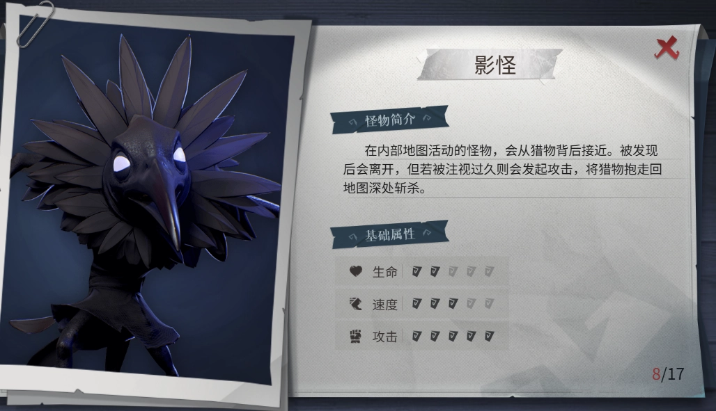 影怪的机制是这样的:它会从玩家背后偷偷摸过来抱住人,然后把人拖到角落里直接秒杀;但要是被玩家正面看到,它就会往后退。另外它还能隔着门攻击,也能攻击处于高低差位置的玩家。玩家被抱住后可以挣扎,趁它眩晕的时候攻击两下,接着后退一步再砍两刀,就能瞬间把它击杀。