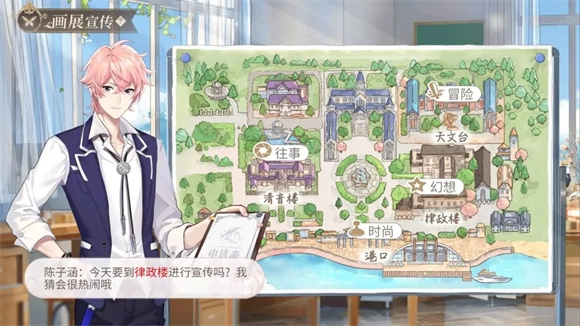 画展在综合楼举办,有4个可选场地。通常陈子涵推荐的红色字场地是最优选择,不过偶尔他也会“抽风”推荐次优场地。等级越高,等级加成也越高,画展结束时能获得的金币就越多。这里要留意一个隐藏成就,需要连续3次选择不符合主题的卡片去参加画展。