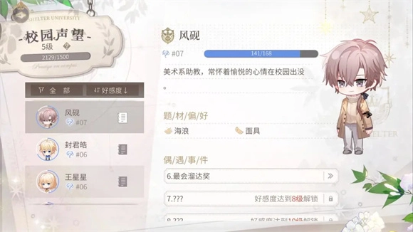 在校园场景里能开展不少互动操作,比如点击左下角的小爱心图标,就能查看各位男主的好感度等级,还能直接跳转至对应的笔记页面。