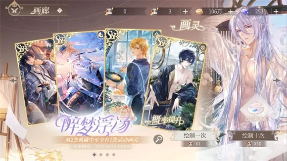 在活动卡池中,全部活动卡共同分配70%的获取概率,剩下的30%概率由常驻卡池中排除“月与晨星”和“暗夜圆舞”这两张卡之外的所有常驻卡共同分配。活动卡池支持许愿功能,若许愿的是SSR画灵,那么许愿的这张画灵必定会是抽到的第一张活动SSR卡;并且,要是抽到的第一张SSR是常驻卡(也就是“歪”到了常驻卡),则第二张抽到的SSR就一定会是许愿的那张SSR画灵。如果许愿的是SR画灵,那么在进行十连绘制(这里特指一次性连续绘制十次,不包含单次绘制的情况)时,这张许愿的SR画灵必定会出现在十连结果里。需要说明的是,只有活动卡池设有许愿机制。另外,活动卡池和生日卡池都有绘制奖励。在活动卡池里,还可以通过点击“绘制一次”按钮左侧的放大镜图标,查看活动卡灵在满级、满特技、小技能双十状态下的具体数值。