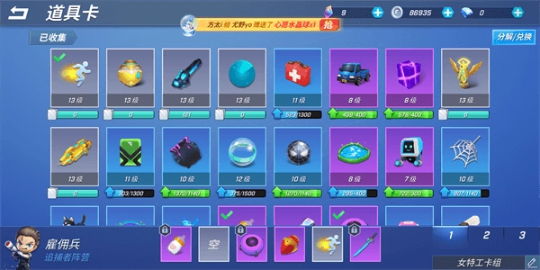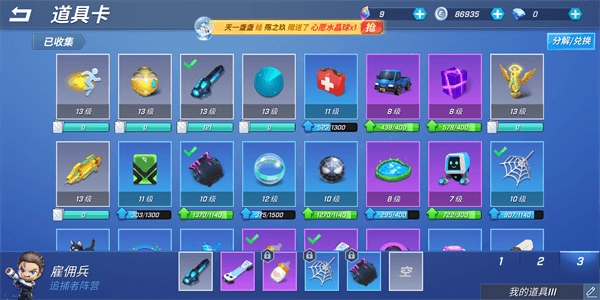 雇佣兵配备的装备有能量剑、雷达、滑板、魔法墙和战术捣蛋,其中雷达、滑板、魔法墙这中间三个是锁定状态。