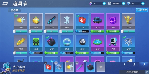 泷(水之忍者):能量剑、医疗箱、飞爪、酒桶、疾跑(锁定前三个道具)