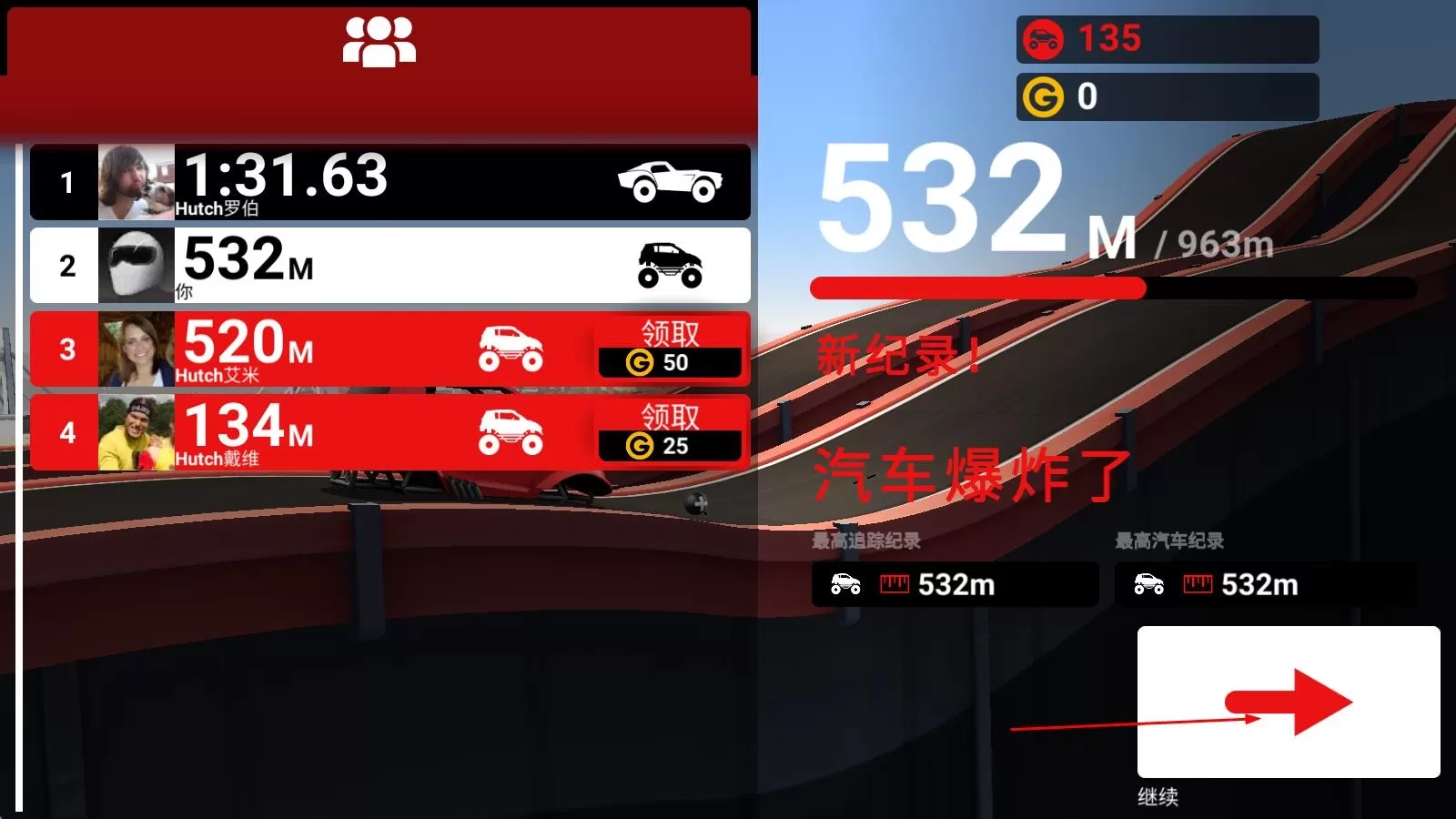 3、PVP竞技玩法:可与好友开启快速PVP比赛,于陡峭路径上较量驾驶技巧,一决谁行驶得更远,增强游戏互动体验。