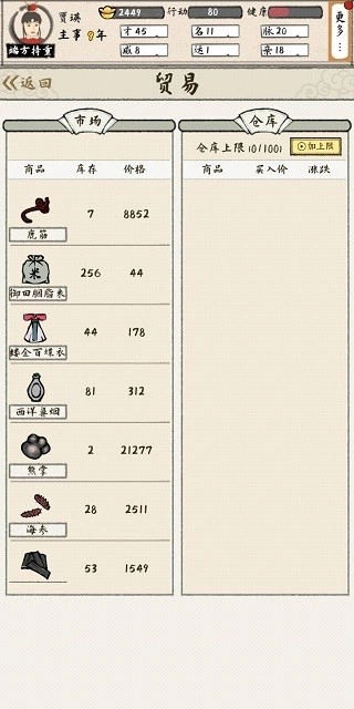 在《红楼梦人生》里,积累财富的途径有三种:稳定的科举所得、逐渐减少的产业收益,还有不稳定的贸易进账。这三者当中,贸易进账需要玩家时刻留意每回合市场刷新的产品情况,通过低买高卖的方式赚取差价利润。