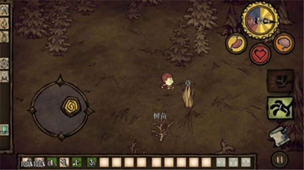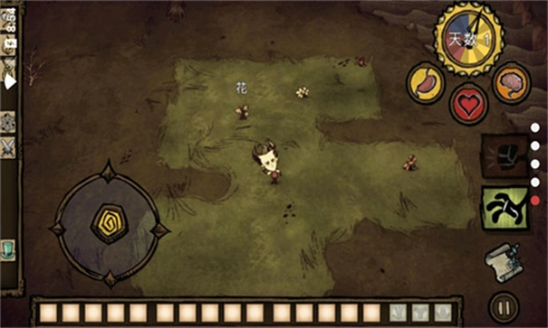 游戏随即正式启动,左侧按键用于操控角色移动方向,右侧按键则负责资源收集功能。玩家需尽可能收集所有可利用的资源,以此应对饥荒危机、维持生存。