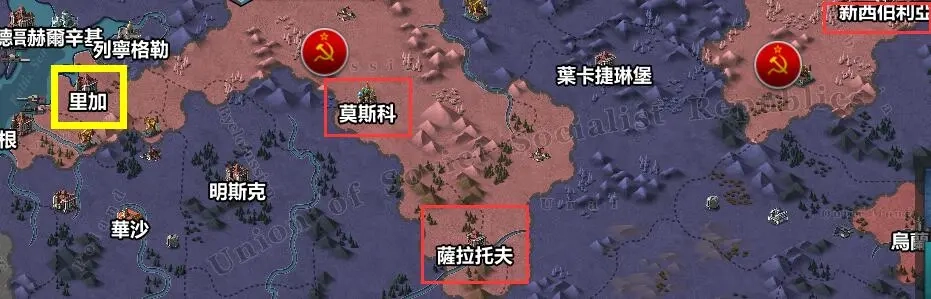 苏联开局的主要战场分为四个方向,分别是里加方向、莫斯科方向、萨拉托夫方向和新西伯利亚方向。在这四个方向里,里加方向的重要性最为突出,剩下的三个方向都属于起配合作用的次要方向。