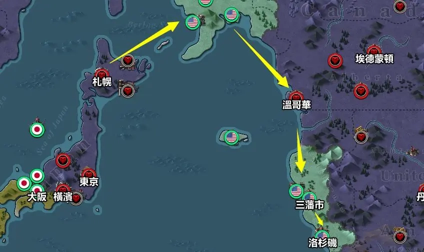 若计划从亚洲方向登陆美洲与澳洲,可将东京和安克雷奇设为关键节点:东京设有导弹基地,若采用远程导弹,能够覆盖太平洋上的两座岛屿以及整个北美西海岸;即便选用中程导弹,也能打击到中途岛。而安克雷奇具备三级机场,在尚未掌握远程导弹技术的情况下,可借助札幌-安克雷奇-温哥华-旧金山及洛杉矶这一线路,开展空军打击与空降行动。
