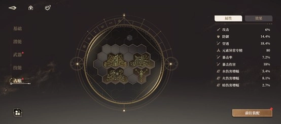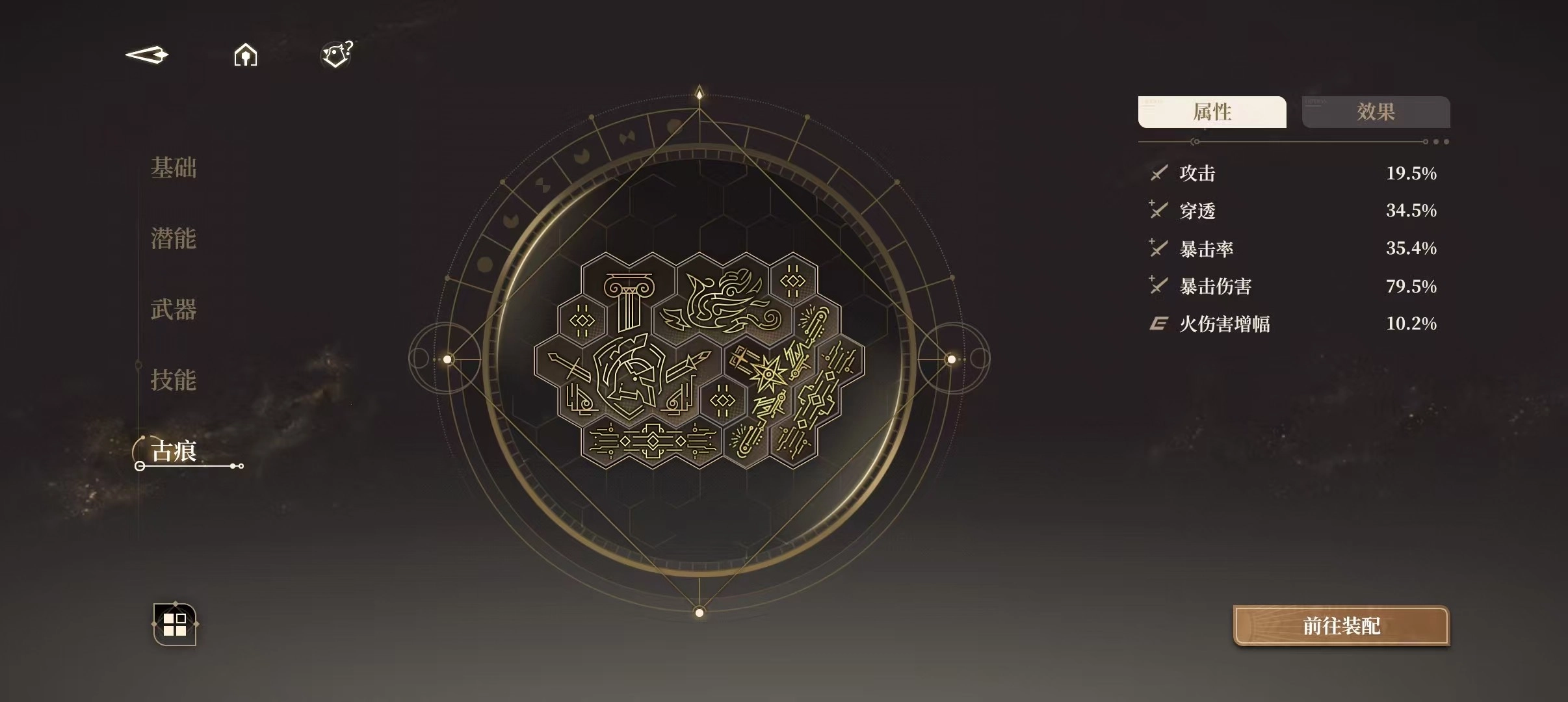 古痕可视为一种身体附魔机制,它为角色带来的属性提升以百分比形式呈现,同时还会附加不同元素伤害的增幅效果与元素异常专精属性,玩家可通过基础面板查看经古痕加成后的各项具体数值。