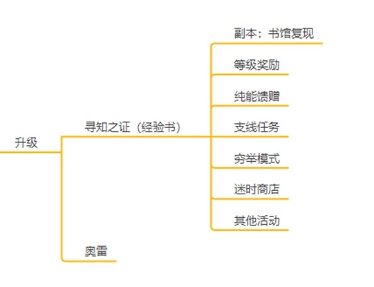 升级主要依靠蓝色、紫色、金色三个级别的寻知之证(经验书)来完成,寻知之证的获取渠道可参考下图: