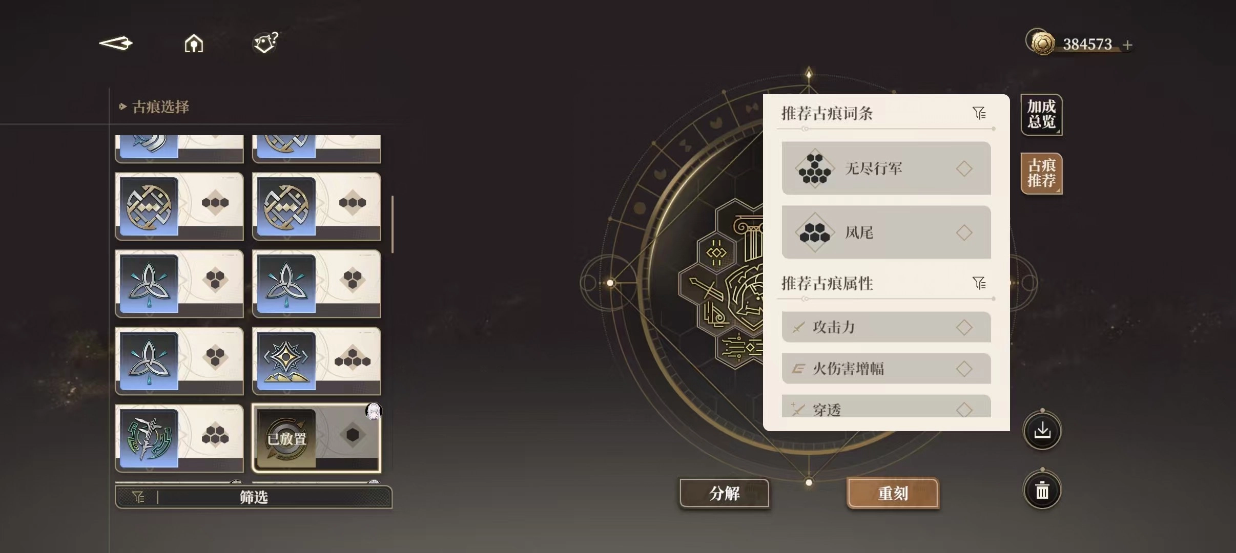 古痕系统里包含三种不同等级的古痕,其中1孔和3孔属于低级古痕,这类古痕没有附加效果;5孔是中级古痕,会带有一条无法叠加的效果;10孔则为高级古痕,重复装配时其效果可以叠加。在填充古痕的过程中,建议按照10孔>5孔>3孔>1孔的优先级来操作,这是由于古痕的等级越高,所能提供的数值加成也就越大。