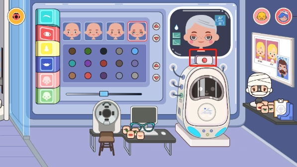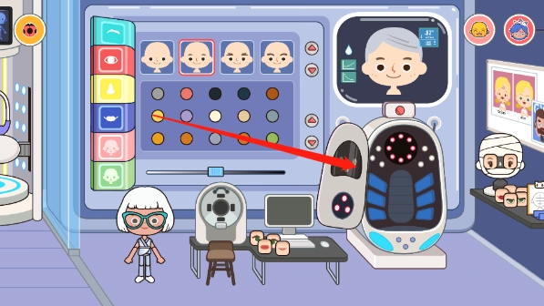 第一层的柜子里存放着店服,您可以在这里进行染发操作,理发衣可供穿着。第二层柜子内有面膜,完成整容后按下红色按钮即可。