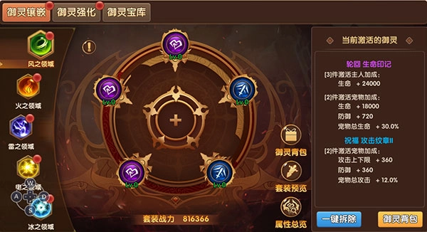 需要留意的是,御灵存在套装属性机制:相同种类、相同颜色的御灵,集齐3个或2个会激活不同的百分比属性加成,其中3+2的组合方式是效果最优的搭配方案。关于御灵套装的选择,建议结合宠物自身特性来进行:比如像巴风特这类高攻击型宠物,其所属领域可搭配攻击套装(3件)加生命套装(2件),通过百分比攻击加成能让它的输出能力变得格外强劲;而守护天使这类高血量高防御的宠物,则推荐搭配生命套装(2件)加防御套装(3件);其余宠物的套装搭配,参照这个思路类推即可。