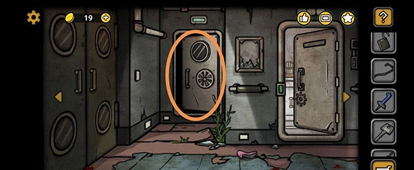 我们回到最初所在的房间,点击大门,用钳子剪断连接处,出门后在左侧门的下方拿到铁丝。