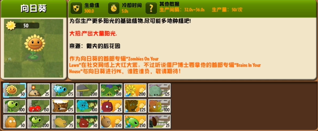 向日葵:作为能为你产出更多阳光的基础植物,建议尽可能多种植!它的大招效果是生成大量阳光。