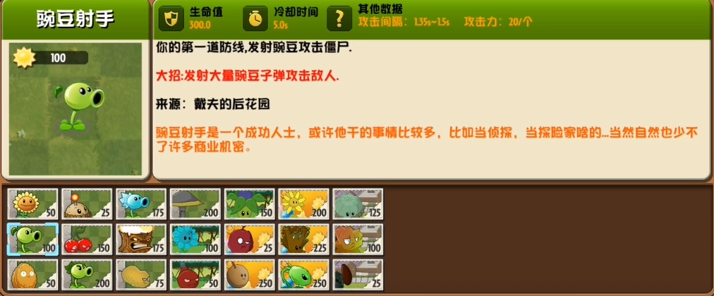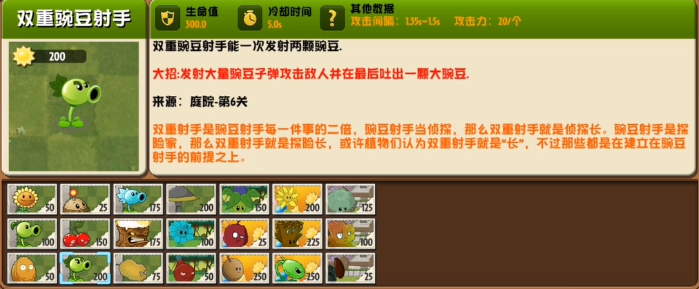 双重豌豆射手:这种植物可以一次性射出两颗豌豆。它的大招是:向敌人倾泻密集的豌豆弹幕,并且在攻击的末尾会喷射出一颗巨型豌豆。